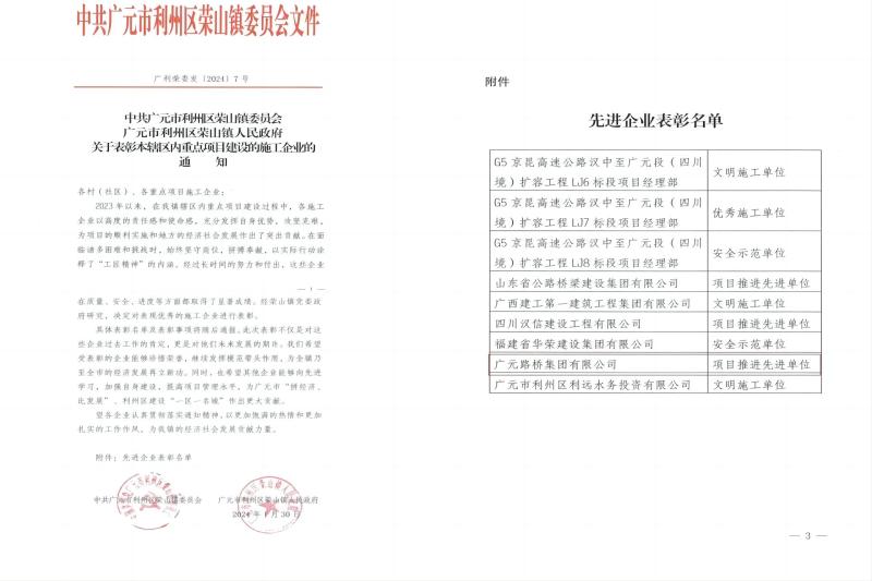 1月30日,公司收到利州區(qū)榮山鎮(zhèn)委員會、榮山鎮(zhèn)人民政府發(fā)來的關(guān)于表彰本轄區(qū)內(nèi)重點(diǎn)項(xiàng)目建設(shè)的施工企業(yè)的通知{廣利榮委發(fā)(2024)7號},路橋集團(tuán)被點(diǎn)名表彰,路橋集團(tuán)榮山鎮(zhèn)高坑口至周家壩項(xiàng)目部在面對建設(shè)前期諸多困難和挑戰(zhàn)時,迎難而上,發(fā)揚(yáng)拼搏奉獻(xiàn),以實(shí)際精神詮釋了“工匠精神”的內(nèi)涵。