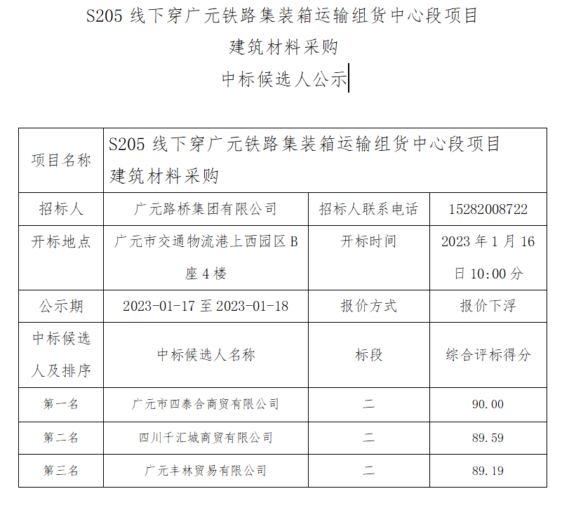 廣元路橋集團(tuán)有限公司S205線下穿廣元鐵路集裝箱運輸 組貨中心段項目建筑材料采購中標(biāo)候選人公示